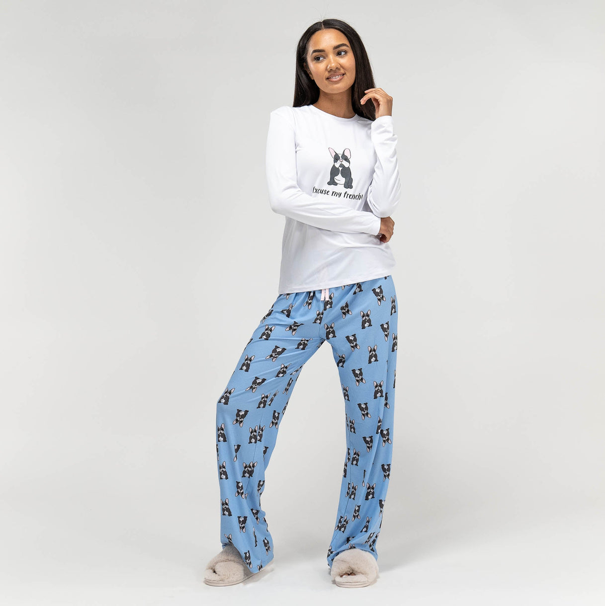 Piżama damska z dżerseju Napis buldożek francuski, rozmiar: S-L, Niebieski / Biel– Big Bertha Original Poland